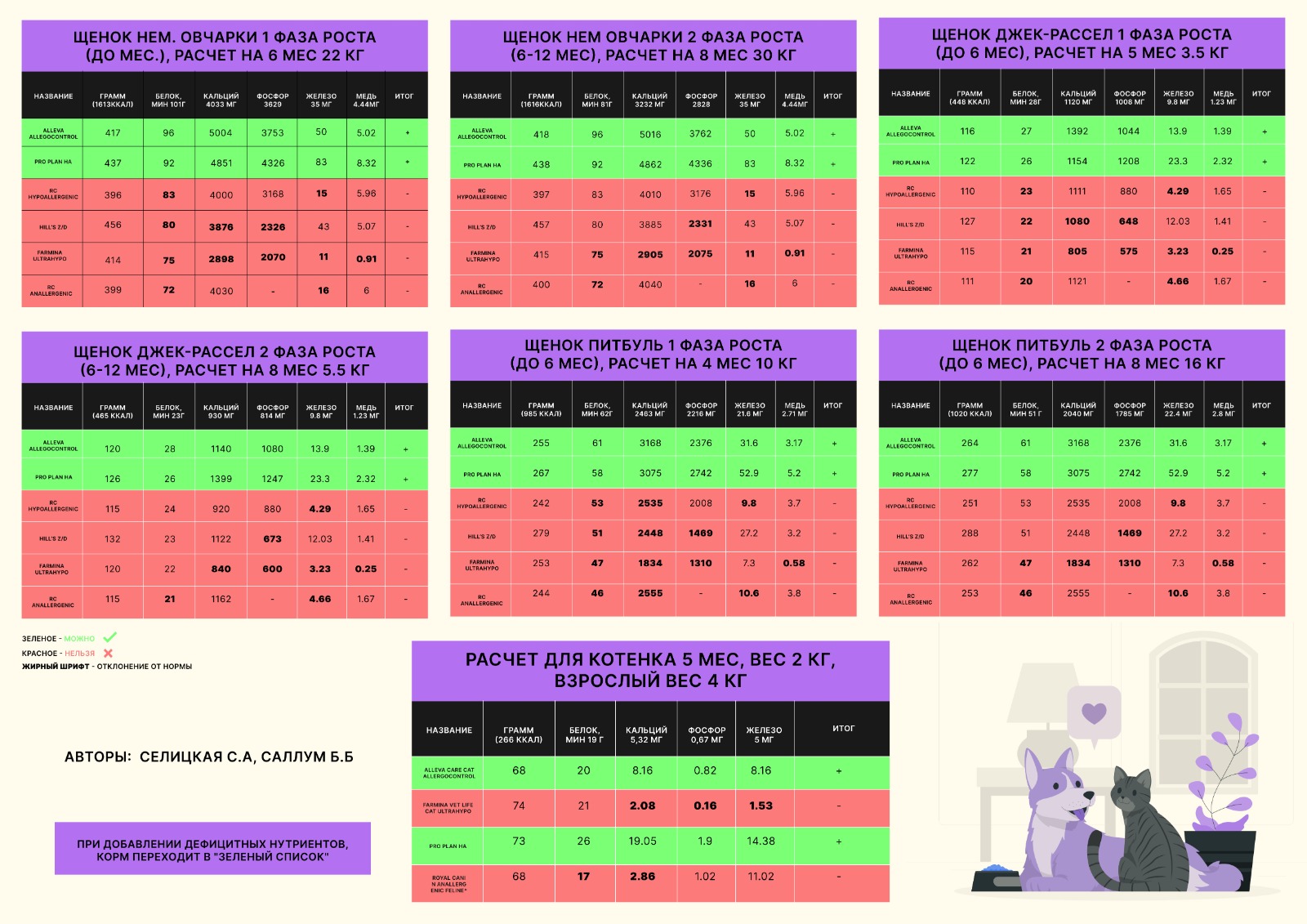 Наша команда произвела расчеты нутриентов на несколько групп собак, мы взяли несколько «частых» аллергиков в разных весовых категориях, и произвели расчет на несколько периодов роста, эти данные помогут вам сориентироваться, при выборе гидролизованной диеты для пациента.